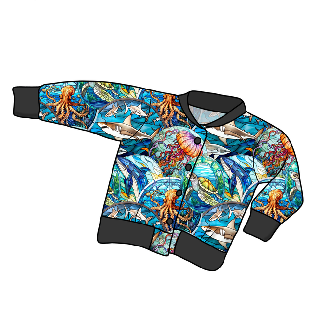 Take a look at this Stained Glass Sealife Bomber Jacket! If you're looking for something unique that will make your little one look extra cool, you've found it right here! Made from super comfy Cotton Lycra (95% cotton 5% elastane), these Bomber Jackets are Oeko-Tex certified and printed using vegan-friendly dyes.